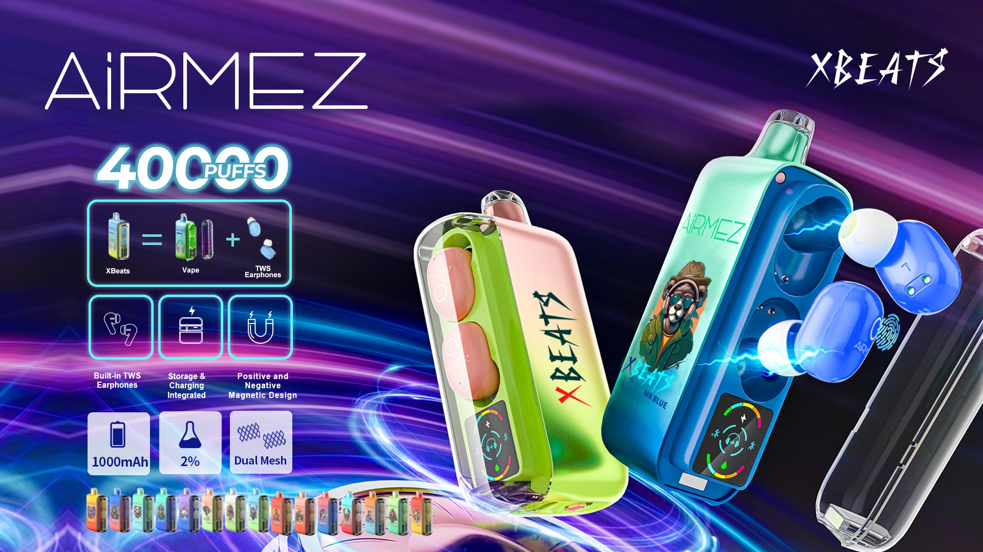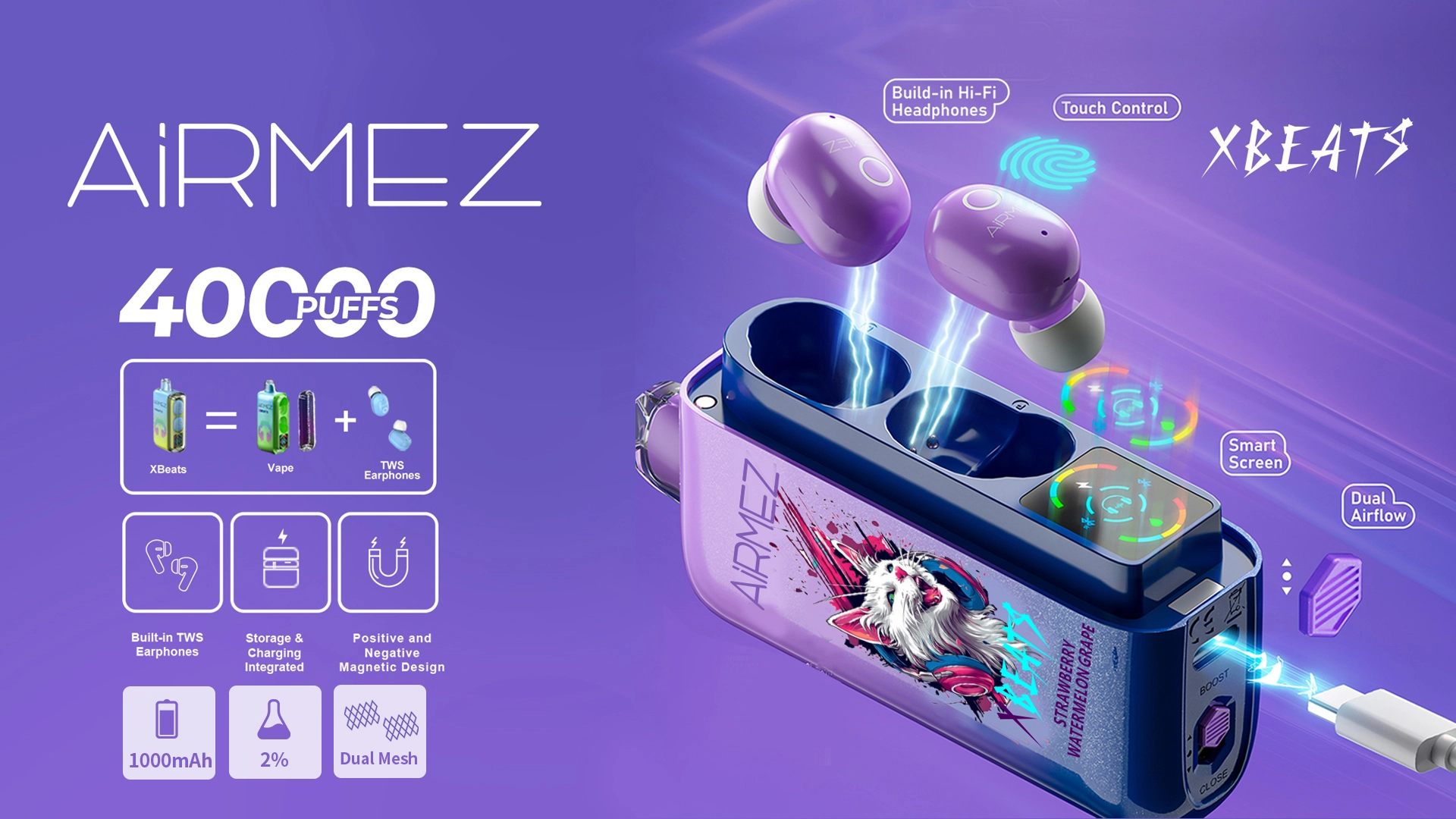 Airmez Xbeats—the ultimate fusion of high-performance vaping and premium audio. This revolutionary device features in-built TWS earbuds, offering seamless music and calls without the need for extra gadgets. The integrated storage and charging case ensures your earbuds are always ready for action. With 40,000 puffs and a powerful 1000mAh battery, enjoy uninterrupted vaping and music all day. Airmez’s Dual Mesh Coil Technology guarantees rich flavor and smooth clouds, while adjustable airflow gives you full control. With 15 delicious flavors and a unique, stylish design, Airmez Xbeats offers an experience that’s truly next-level.