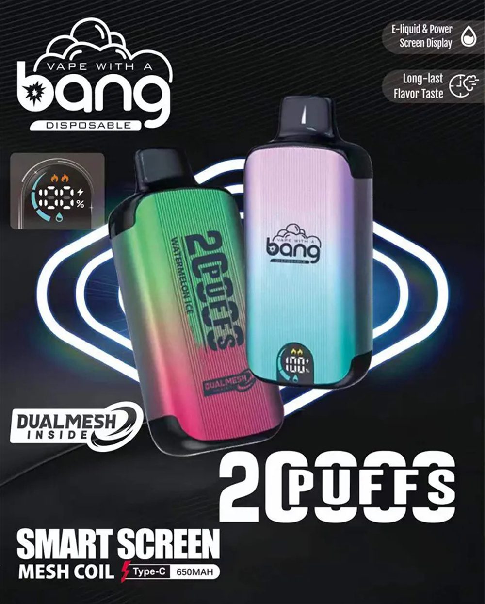 The Bang 20000 Puffs Dual Mesh is engineered to deliver up to 20000 puffs per device, thanks to its impressive 28 mL pre-filled e-liquid capacity. This ensures a prolonged vaping experience without the need for frequent refills. With its 650mAh rechargeable battery, you can enjoy extended sessions while minimizing waste and cost. The type-C charging port makes recharging quick and convenient, further enhancing the user experience.